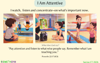 Our character training program is developed to include practical application during class time. For example, when students are learning about stewardship of time, coaches may ask them, “Are you using your time well on bars right now?” Or when a student gets distracted, the coach may ask “What should you be paying attention to right now?”