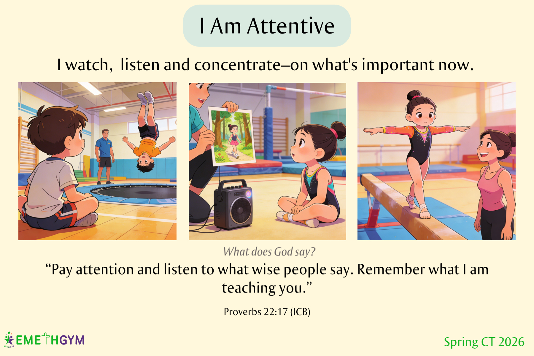 Being attentive is really about your mind being here. It’s the skill of controlling your mind — choosing what you think about, what you look at, and what you focus on. And here’s the key word — skill. A skill — just like every skill you’re learning in this gym. This season can be a big opportunity for growth in your sport if you develop and implement this important quality into every practice.